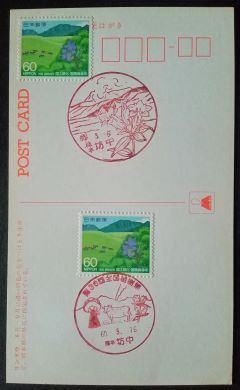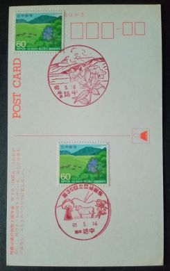 特印(千葉中央局、日付:1985年5月10日)、裏面は熊本・坊中局の風景印&第36回全国植樹祭の小型記念印(日付:1985年5月16日)