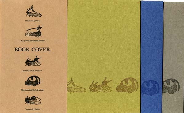 カバーにデザインされているツノゼミは、バラトゲツノゼミ・ヨツコブツノゼミ・ハチマガイツノゼミ・マルエボシツノゼミ・アリカツギツノゼミの5種類です。