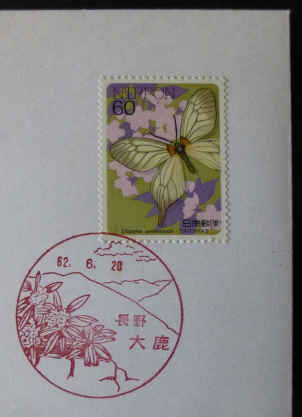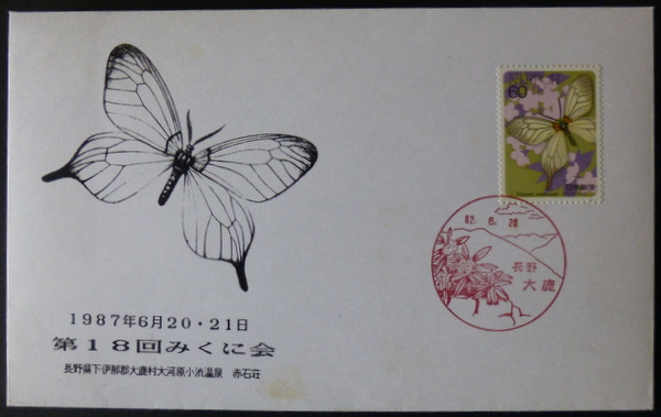 風景印(長野・松川局):300円(送料別) ※風景印の意匠は「アサギマダラと縄文土器」、日付は切手発行日(1987年1月23日)